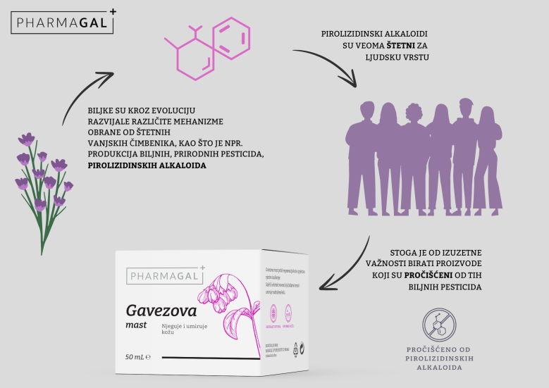 Kako bi se minimizirao rizik od toksičnih utjecaja pirolizidinskih alkaloida koji se nalaze u više od 6000 biljnih vrsta, od izuzetne je važnosti kontrola ulaznih biljnih sirovina na samom početku proizvodnje određenog biljnog pripravka. Tako je u laboratoriju Pharmagala razvijena jedinstvena Gavezova mast na tržištu, upravo s ekstraktom korijena gaveza pročišćenog od pirolizidinskih alkaloida kako bi svojim korisnicima zajamčio dodatnu sigurnost tijekom upotrebe ovakve tradicionalne masti.